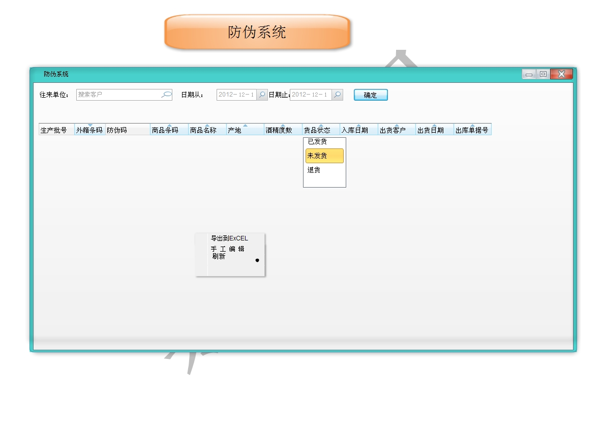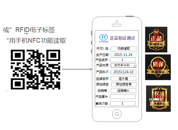 • 在每瓶酒上貼上自定義條形碼或者RFID電子標(biāo)簽,,并把內(nèi)部自定義條形碼或者RFID電子標(biāo)簽ID號(hào)數(shù)據(jù)錄入一統(tǒng)公司總部系統(tǒng),在各個(gè)加盟店都配置一臺(tái)專用防偽查詢條碼掃描器或RFID讀卡器,這樣客戶在購(gòu)買完...